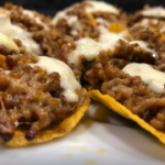 • Die Mischung auf die Stapelchips verteilen und mit etwas Käse bei indirekter Hitze (200-220 Grad für ca. 3-4 min. überbacken.