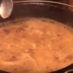 - In einer Pfanne etwa 125 g Butter schmelzen und mit 5-6 EL Mehl eine helle Mehlschwitze herstellen. Den Dutch Oven mit der Füssigkeit wieder erhitzen und die Mehlschwitze einrühren. Kräftig rühren, damit nichts klumpt.