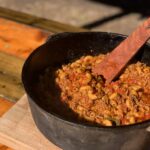 - Das Rindfleisch in eine große gusseiserne Pfanne oder Dopfdeckel zerbröseln und bei mittlerer Hitze braten. Wenn das Fleisch anfängt braun zu werden, die Zwiebel unterrühren. Weitergaren, bis das Fleisch gebräunt ist.