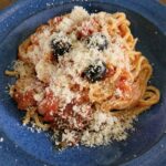 - Spaghetti aus dem Kochwasser nehmen und zur Guanciale-Tomatensauce in die Pfanne geben. Auch die Oliven mit in die Pfanne geben und vermengen.