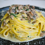 - Mit der Pasta, hier Fettuccine Boscaiola beginnen.