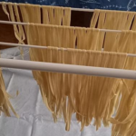 - Danach den Teig mit dem Nudelholz oder mit der Nudelmaschine dünn ausrollen und als Pasta zuschneiden (mit dem Messer oder Maschine). Die geschnittene Pasta noch einmal 15 Minuten ruhen lassen.