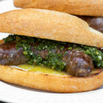 • Das Hot Dog Brötchen aufschneiden, die Wurst hineingeben und mit Chimichurri garnieren.