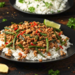 - Den Reis zusammen mit der Hackfleisch-Gemüsemischung auf einem Teller anrichten. Dazu den Joghurt-Minze-Dip servieren.