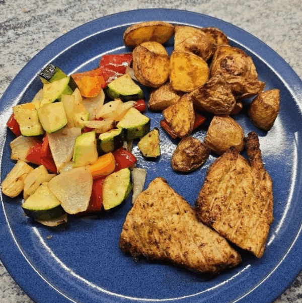 - Nach 8 Minuten das Gemüse einmal wenden und die Steaks drehen