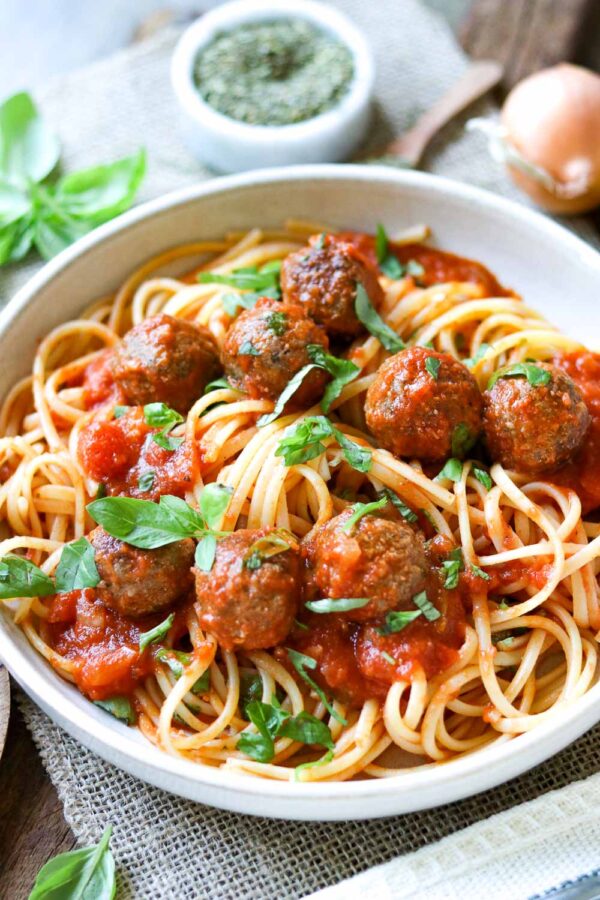 3. Danach die passierten Tomaten mit italienischen Kräutern für die Soße vermengen und die Hackbällchen übergießen. Dann zusätzlich 1-2 Kellen Pastawasser hinzufügen.
